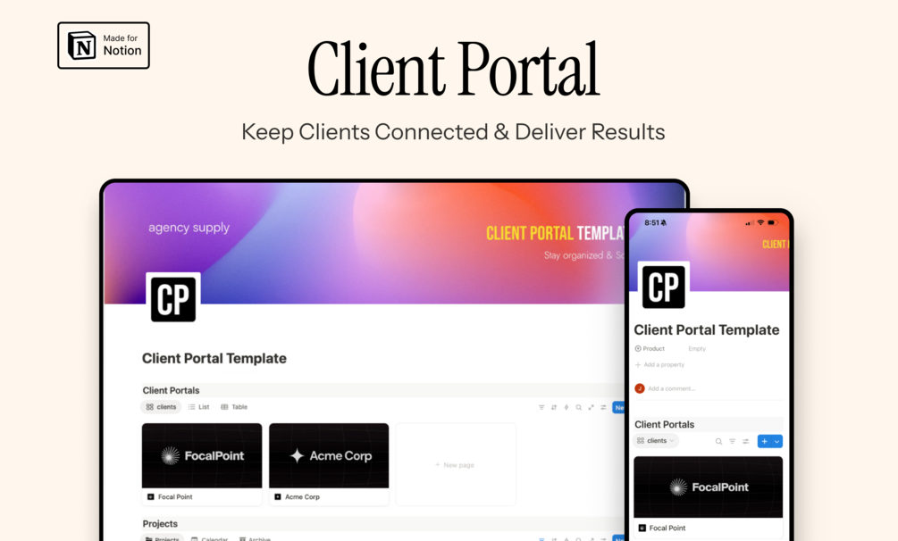 Notion Client Portal Template works with Notion only. It is compatible with Desktop, Laptop, Tablet, and Smartphones. Smartphone and Tablet layouts will appear differently than on desktop or laptop, however, the template's layout is the same.
