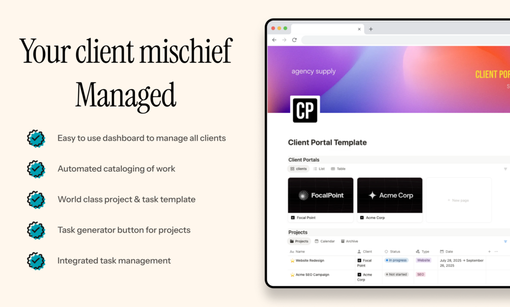 The Client Portal is a Notion template built to help you manage client relationships easier and more effectively than ever before.