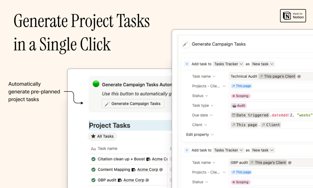 - generator button to automatically create common project tasks