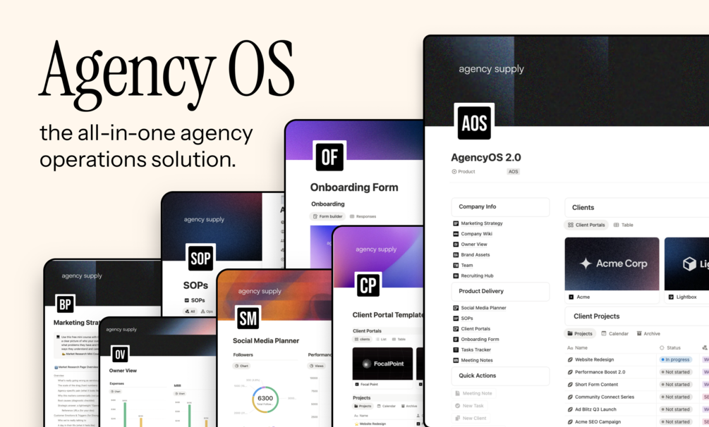āœ… Agency OS Complete System:Ā A comprehensive Notion-based operational hub that streamlines task management, SOPs, client delivery, team check-ins, and pipeline tracking—eliminating chaos and saving 20+ hours/week.