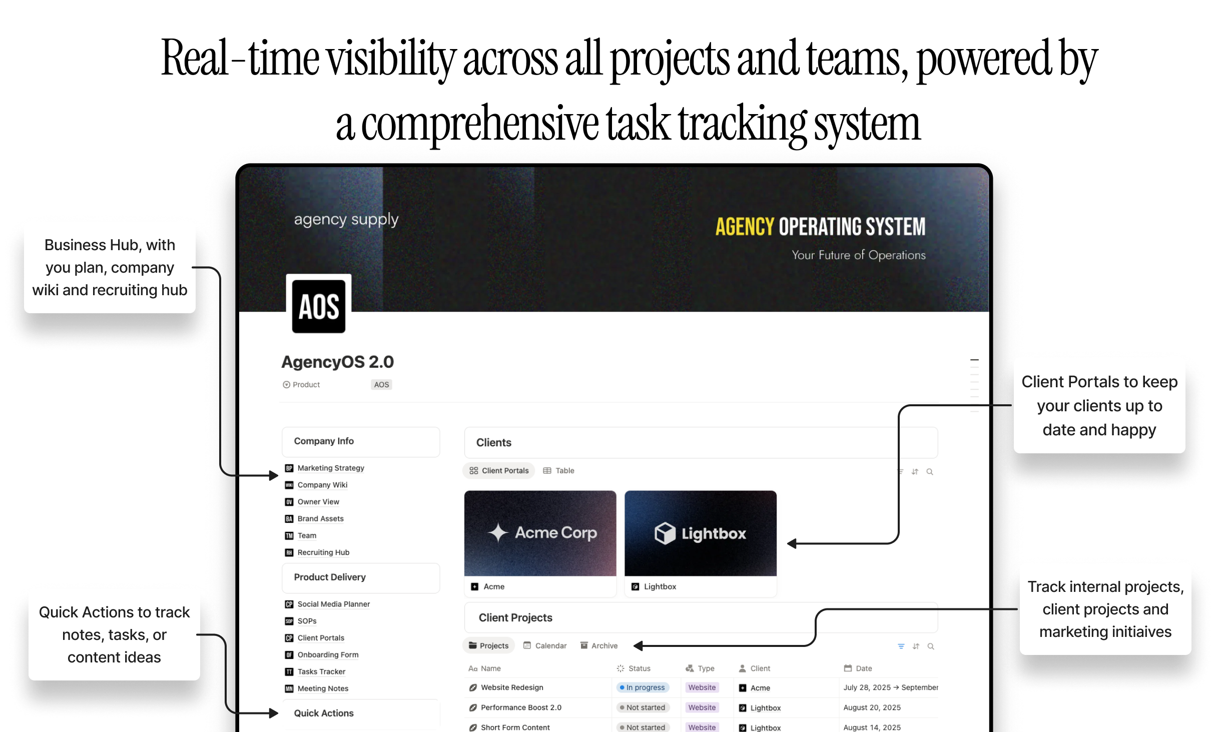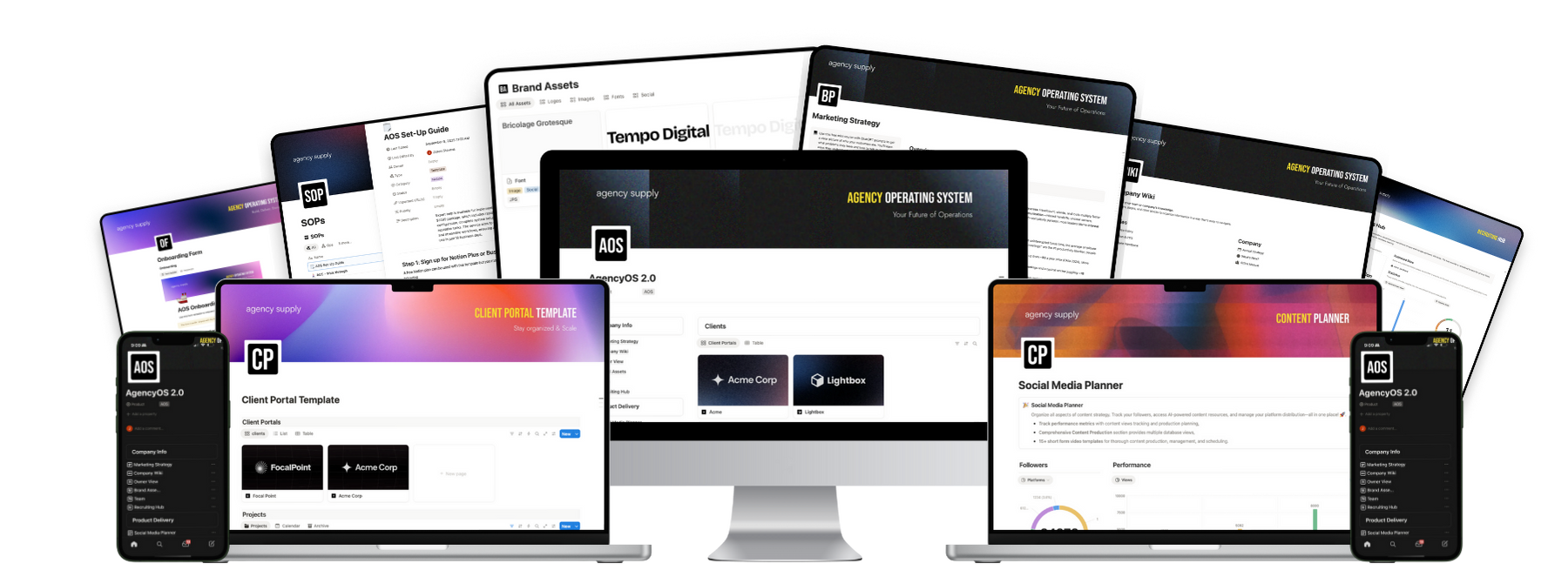 āœ… Agency OS Complete System:Ā A comprehensive Notion-based operational hub that streamlines task management, SOPs, client delivery, team check-ins, and pipeline tracking—eliminating chaos and saving 20+ hours/week.