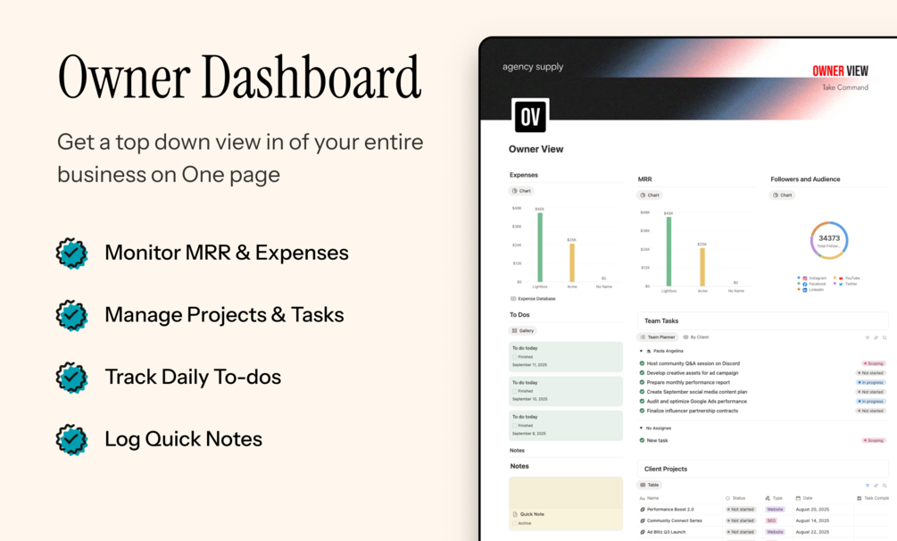 āœ… Agency OS Complete System:Ā A comprehensive Notion-based operational hub that streamlines task management, SOPs, client delivery, team check-ins, and pipeline tracking—eliminating chaos and saving 20+ hours/week.