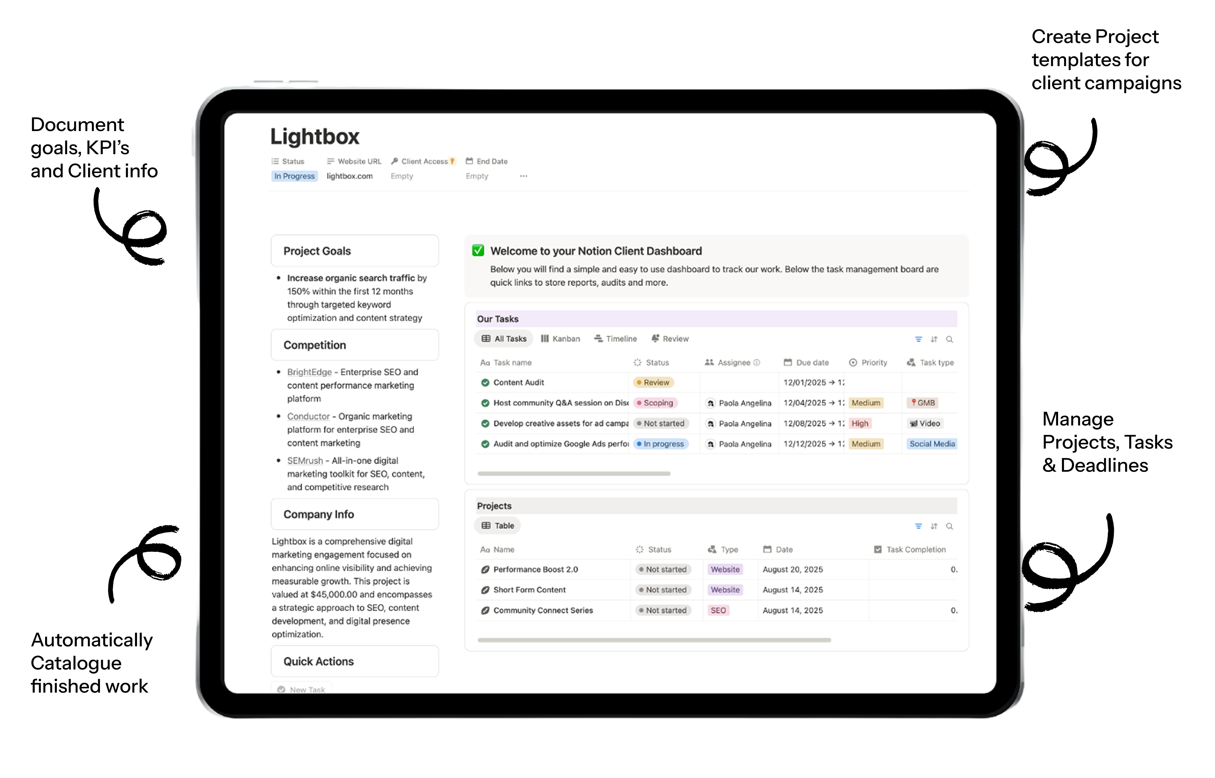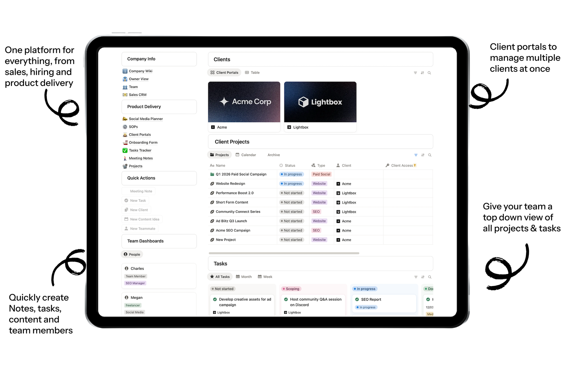 āœ… Team & Project Management Hub:Ā Visual task boards, deadline tracking, and team assignments with clear ownership—so your agency runs like a machine even when you're not there.