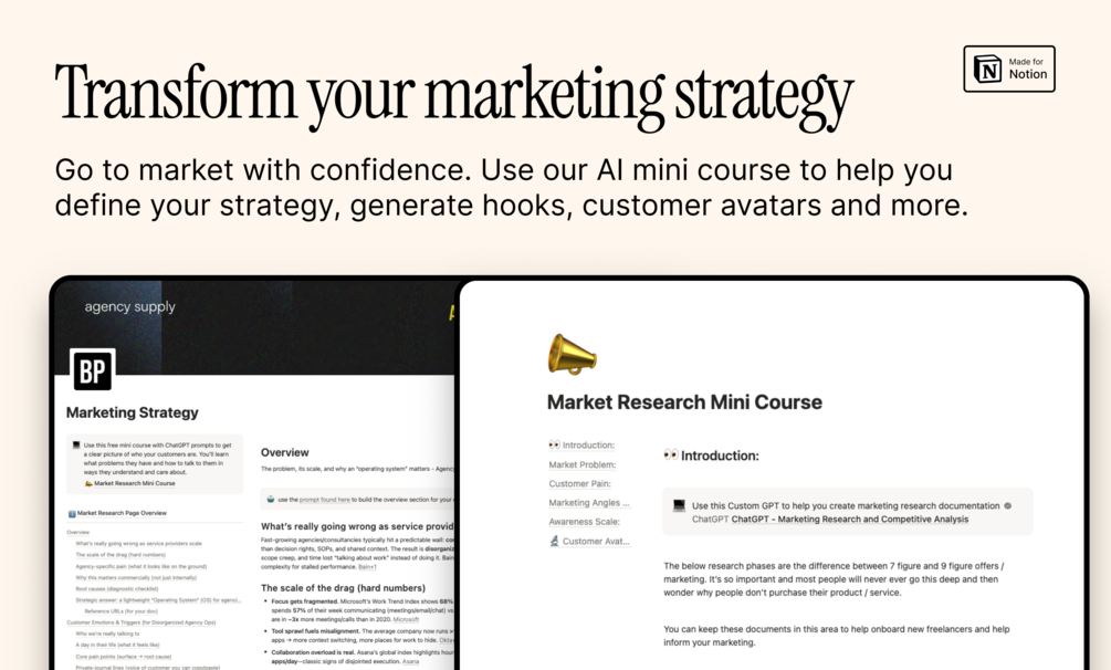 Mini-course + custom-trained Marketing GPT to define your market, positioning, and messaging as you scale—because organized operations mean nothing if your marketing doesn't convert. Go from "we do everything" to "we're known for X" with a clear, compelling position. (Value: $297)