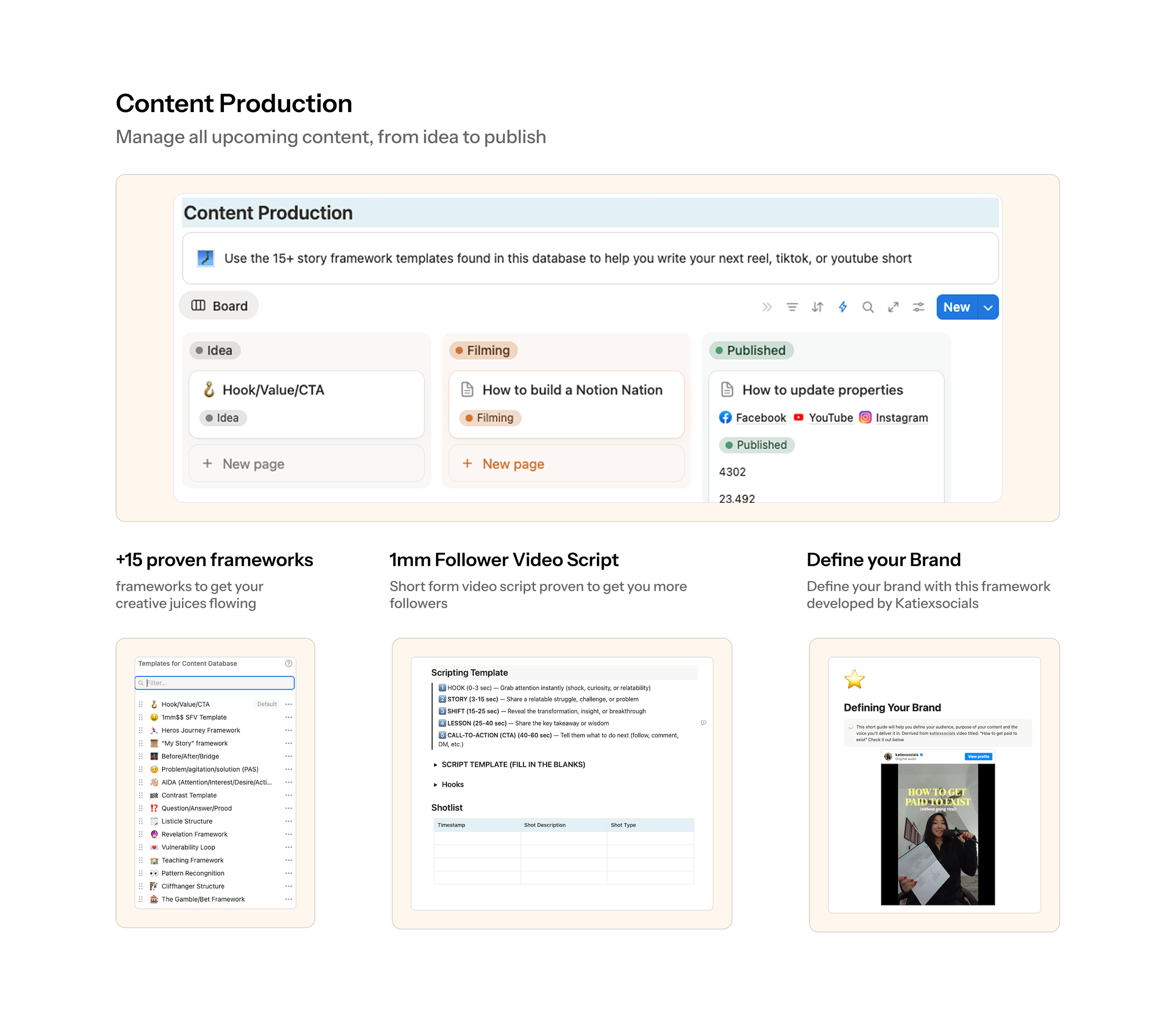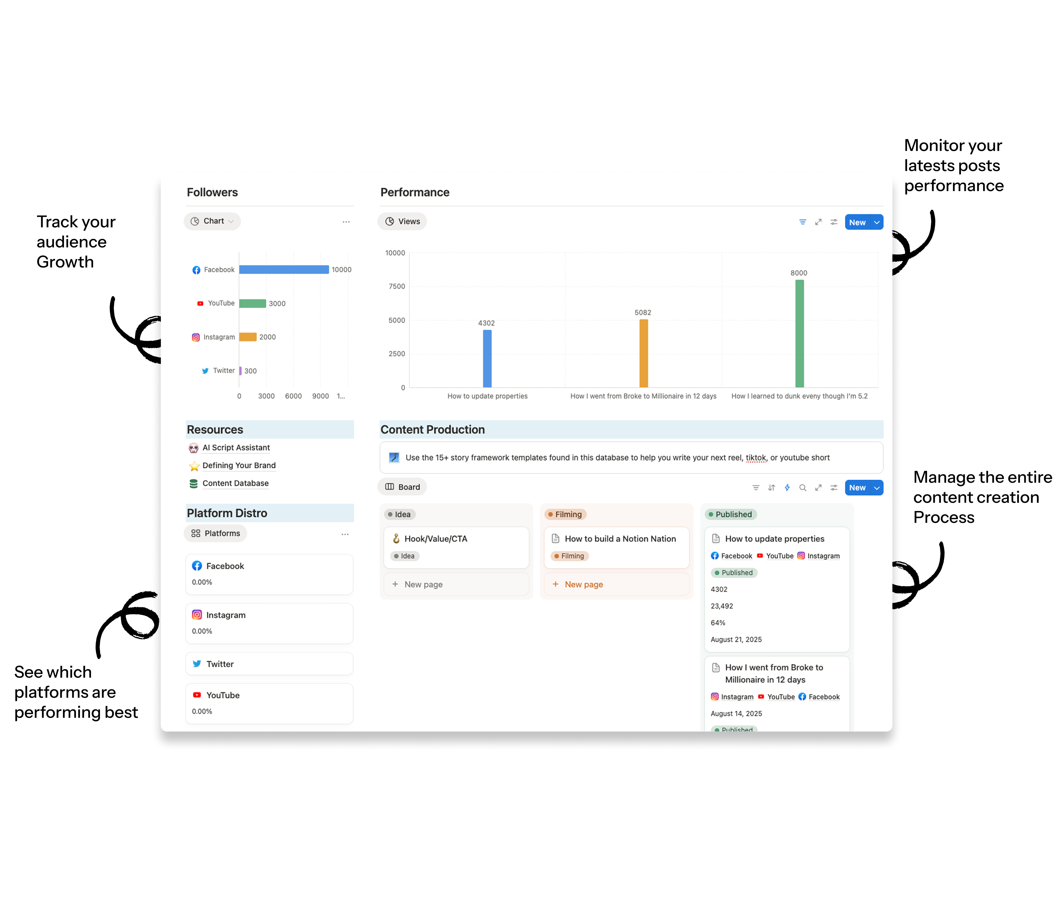 • Comprehensive Content Production System - Access multiple database views to plan, create, and schedule content efficiently